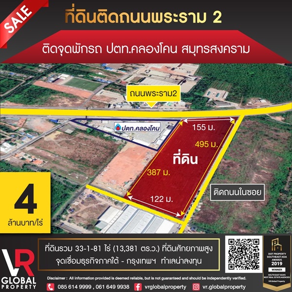 ขายที่ดินศักยภาพสูง ติดถนนพระราม2 ติดจุดพักรถ ปตท.คลองโคน สมุทรสงคราม 3-1-81 ไร่ โทร 085-6149999 ขาย For Sale land